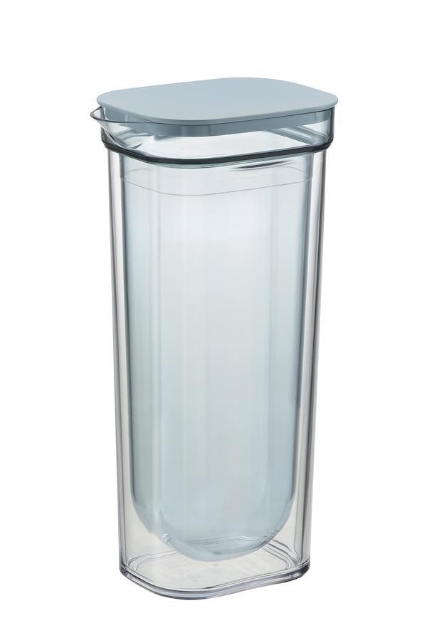 結露しにくく、水滴が下に垂れない二重構造の冷水筒結露した水滴がテーブルに垂れにくい。二重構造なのでぬるくなりにくい。※5度の冷水を26度の室温下に60分放置し15度以下であることを指します底が丸くフタもパッキン無しなので洗いやすい。食卓を彩るクリアなデザイン。冷蔵庫のドアポケットに入るコンパクトサイズ。