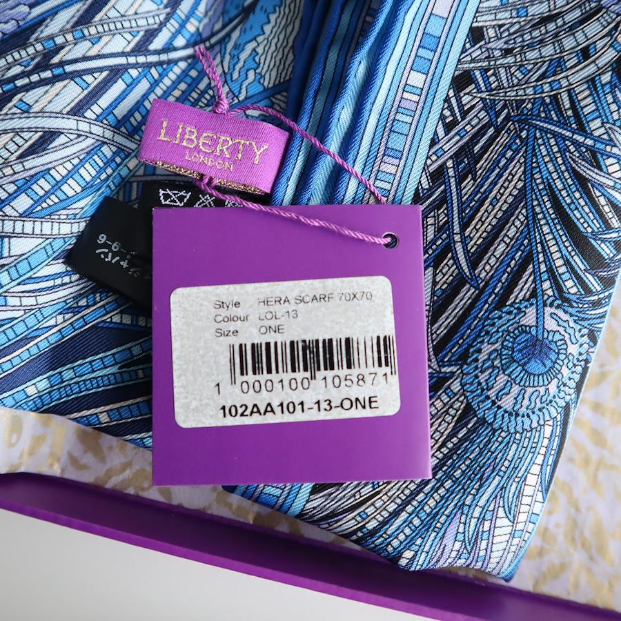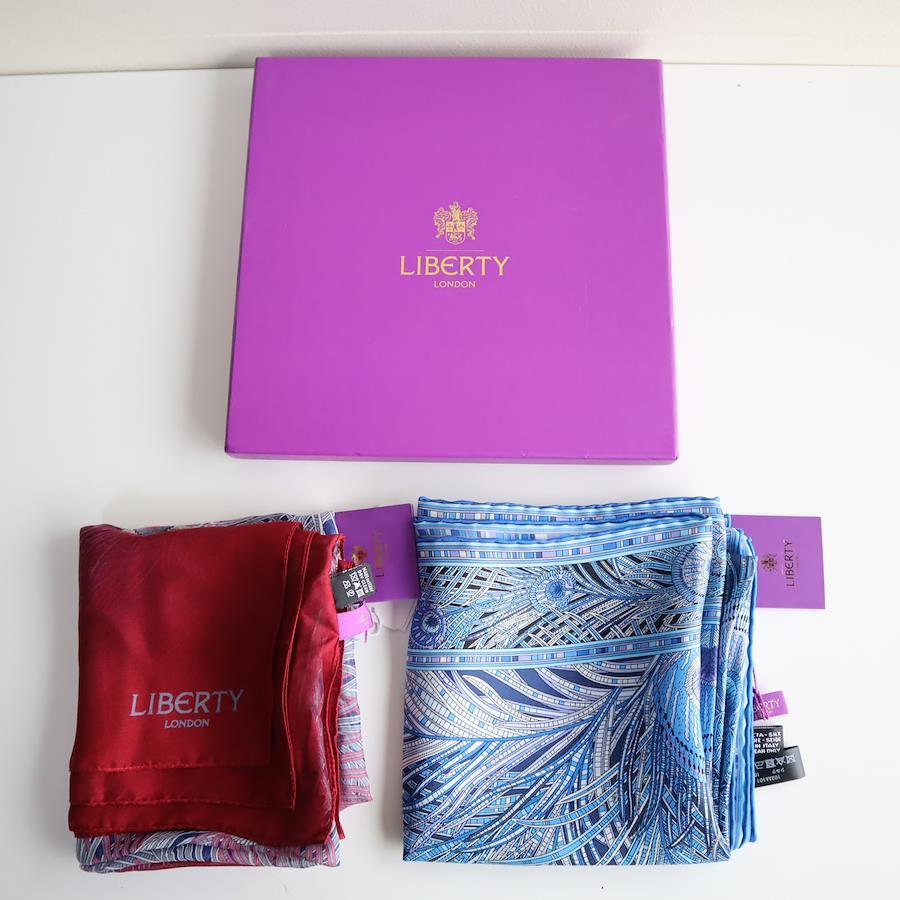 ファッションにこだわりのある女性におすすめの、LIBERTY LONDON(リバティロンドン)シルクスカーフ2枚セットです。なめらかなシルク100%生地と、リバティを象徴する美しい「HERA(孔雀柄)」が特徴で、首元・バッグ・ヘアアレンジなどさまざまなスタイルにお使いいただけます。ブルー系のHERA柄と、上品なレッド系の2枚セットは、コーデに合わせて使い分けできる万能アイテム。