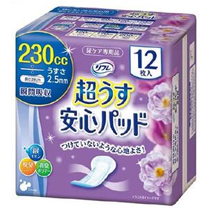■商品概要メーカー:リブドゥコーポレーション商品名:リフレ 安心パッド 超うす 230cc(12枚入)区分:日用雑貨内容量:12枚商品概要:新採用「におい吸着シート」&銀イオン&消臭ポリマーのトリプル効果ですっきり消臭アップ!高吸収ポリマーで安心瞬間吸収!薄さ2.5mmでさらさら快適。お肌を外部の刺激から守り、スキンケア効果もある「やわらかさらさらシート」がお肌を健やかに保ちます。テープをはがすだけで取り出せる「かんたんラップ」採用(花柄プリントつき)。下着にぴったりズレないテープ付です。※吸収量の目安:220cc※医療費控除対象品JANコード:4904585035333商品コード:117803014