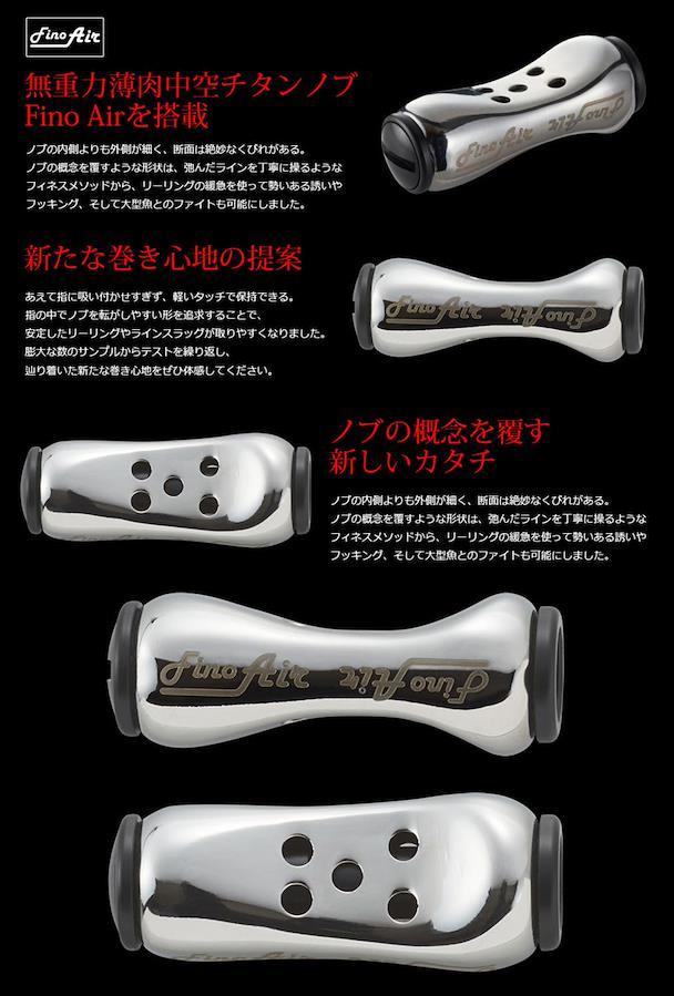 「新たなカタチ・新たな巻き心地」の提案、 「超軽量4.3g」というLIVRE史上最軽量を実現した無重力薄肉中空チタンノブ【FinoAir(フィーノエアー)】搭載。指で摘まむ部分をノブカラーの形状から見直し、可能な限り薄くし、側面から見た湾曲形状も3つの複合Rを組み合わせる事で、摘まむ箇所により、自分好みのフィット感を感じる事が出来る形状になってます。上面からの形状も、外に向かって細くなる(丸くなる)今までに無い形状になっており、丸ノブの良さと平ノブの良さを合わせ持った新しいチタンノブに仕上がっております。