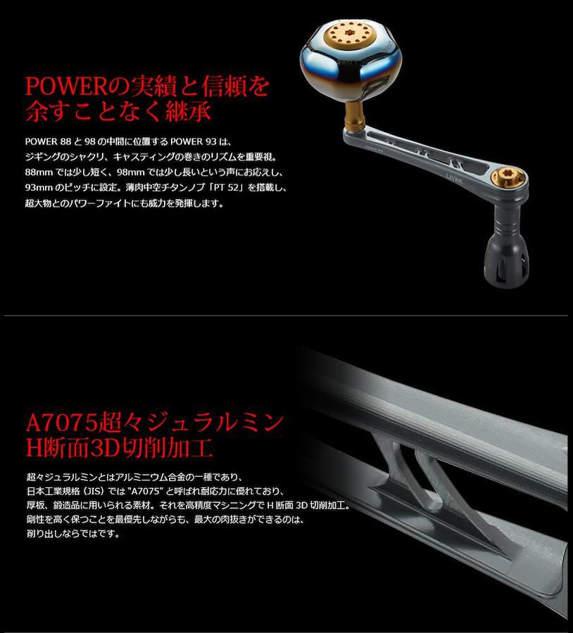 「パワー(Power)」の実績と信頼を余すことなく継承!! ジギングのシャクリ・キャスティングの巻きリズムを最重視した93mmのピッチ設計パワーハンドル【Power 93 (パワー 93)】!!ジギングのシャクリ・キャスティングの巻きリズムを行う上で、既存モデルの「88mmピッチ」では少し短く、「98mmピッチ」では少し長いというニーズにお応えした最適サイズ【93mm】設定を採用!!