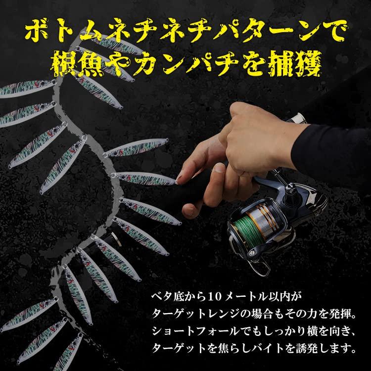 <リア寄りセンターバランスでスロージギングの基本となる形状>潮受けが良く、フォール時のバイトを誘発する形状。竿を大きくあおり、フォールの時間を長くすることで釣果を伸ばすことができます。 <ボトムネチネチパターンで根魚やカンパチを捕獲>ベタ底から10メートル以内がターゲットレンジの場合もその力を発揮。ショートフォールでもしっかり横を向き、ターゲットを焦らしバイトを誘発します。 <様々なターゲットにマッチする、釣果実績の多いカラーバリエーションを網羅>全国のアングラーから人気のカラーを厳選し、ハズレのないラインナップをご用意しております。
