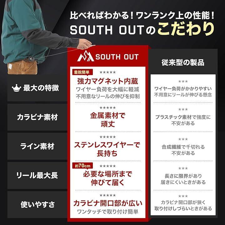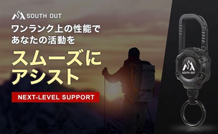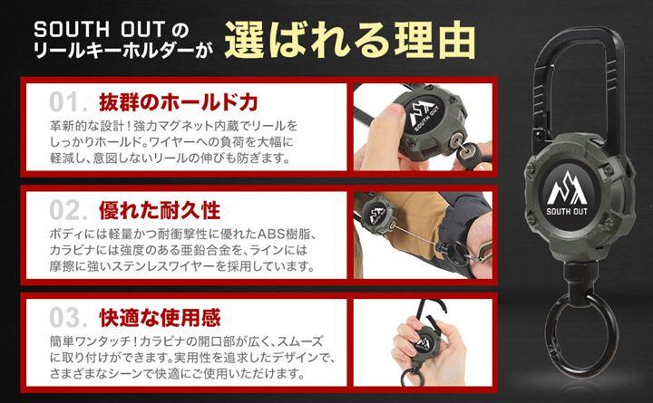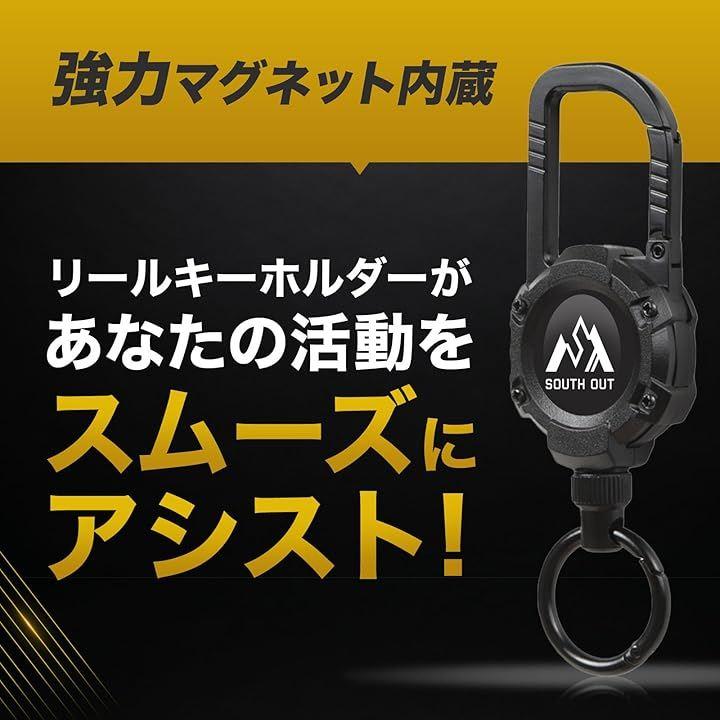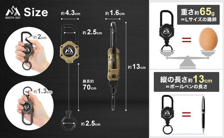 「伸びる。届く。ワンタッチ。」伸縮自在な約70cmワイヤーリール搭載で必要な場所まで伸びる。可動部が360°回転する抜群の取り回しで必要な場所まで届く。上下カラビナ仕様で着脱がお手軽ワンタッチ。