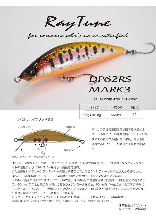 DPシリーズはMARK3となり、バルサコアの最適化、樹脂の大幅軽量化と、それに伴うタングステンウエイトの増量によりバルサミノーをも凌ぐ高性能を獲得。 また生産をレイチューンファクトリー内製とすることで、塗装クオリティーと耐久性が大きく進化した。 DP62RS MARK3には、ベリーアイの前後に4mm×7mmの円柱形タングステンウエイトを配置。 同じ4mm直径の球形タングステンウエイトの2倍、鉄球の4倍の質量を有する円柱オモリを低重心に置くことで、60mmクラスとは思えない切れのあるウォブンロールを発生。50mmミノー並みの操作性で渓流域のパイロットルアーとなり、中下流域ではインジェクションルアーでは攻略不可能な流速、レンジでアングラーの意思を忠実に反映、アピールさせることが可能。 ビッグトラウトをテクニックでヒットに持ち込むためのミノー・・・それがDP62RS MARK3だ。 ※ST36BC#12トレブルフックにも対応します。その場合トゥルーチューンを取り直して下さい。