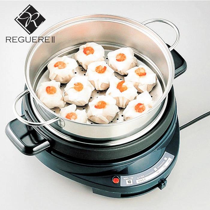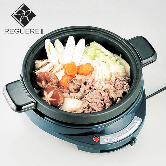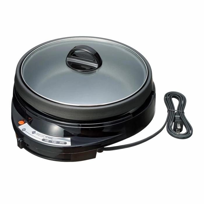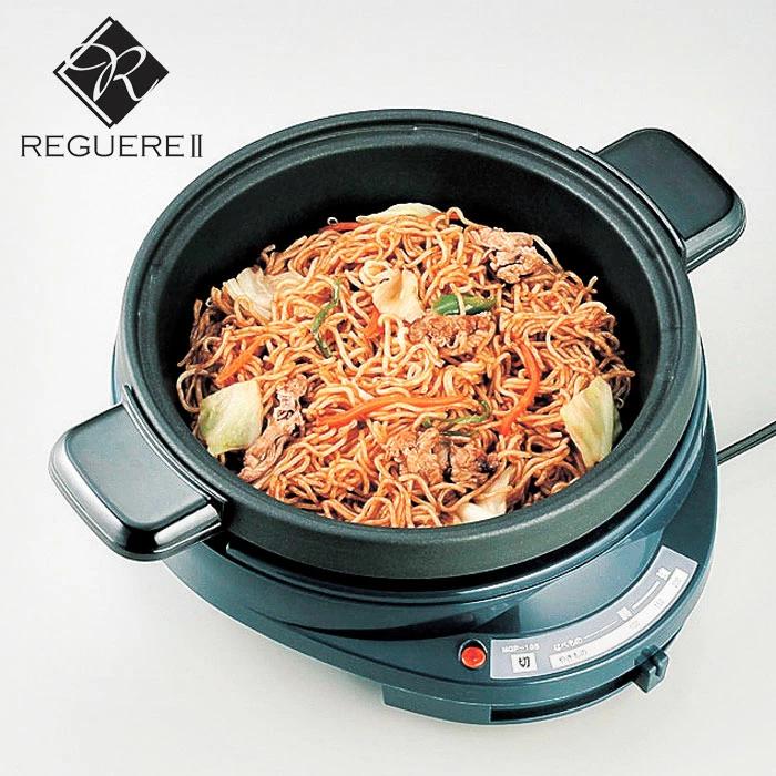 底面が平らなので焼きそばや餃子、鍋料理に使えます。着脱式で内面はこびりつきにくく、お手入れが簡単な「ふっ素樹脂加工」。丸洗いもできます。