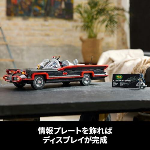 1966年放映のテレビ番組で活躍した伝説のバットモービルが、大人向けのレゴモデルとして復活しました。成形フロントガラスや車輪、外装、開くとバットコンピューターが出てくるトランクなど、リアルな特徴が満載です。車両データを記した情報プレートと、1966年バージョンのバットマンミニフィギュアといっしょに飾ってお楽しみください。