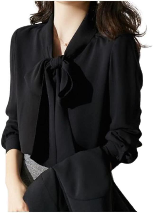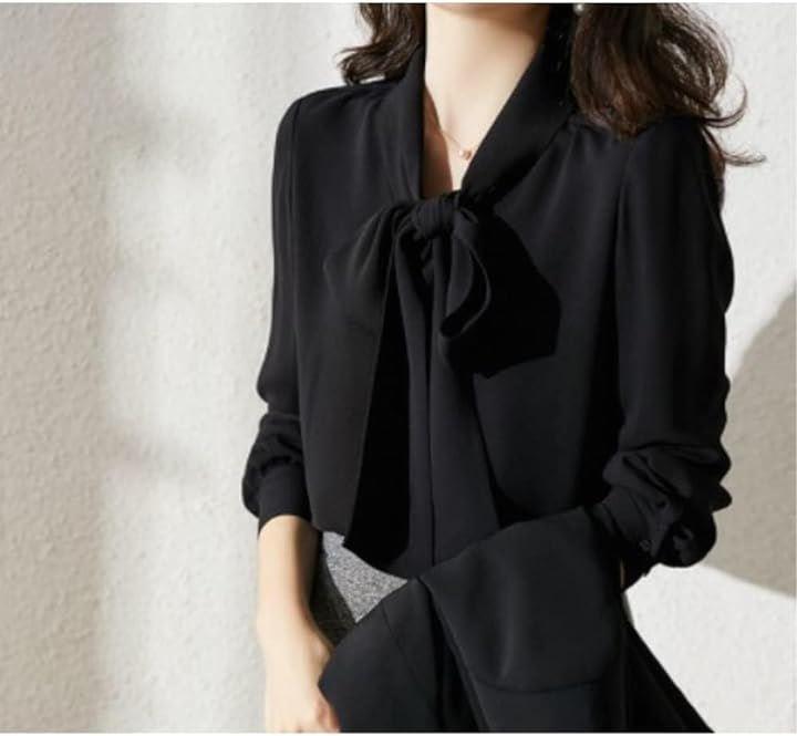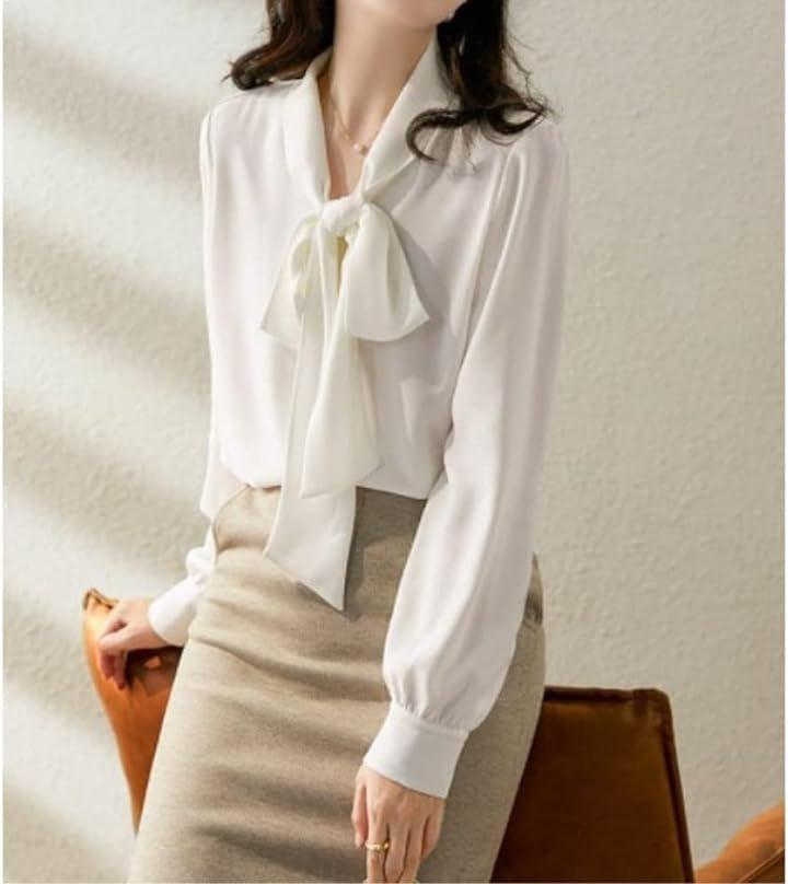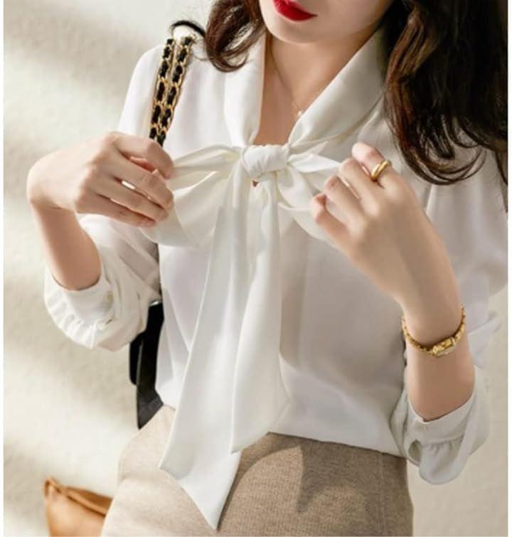 上品で大人可愛い、フォーマルでもカジュアルでも使える、キレイめ長袖リボンのブラウスシャツ。
