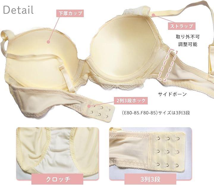 「 特徴 」レース / フローラル / 花柄 / 柔らか / 刺繍 / ストラップ調整可 ・ 取り外し不可 / パッドポケットなし / 取り外しパッドなし / 下厚カップ約 1cm / ワイヤーあり / サイドボーンあり / 透け感 ・ 伸縮性あり / 2列x3段ホック / E80,85 F80,85 3列3段ホック