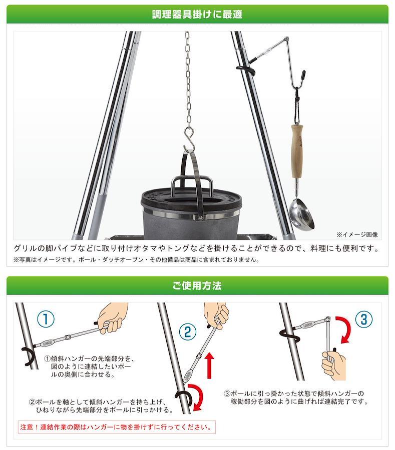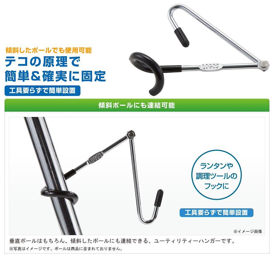 総重量:(約)95gサイズ:(約)26cm 対応ポール径:(約)18~26mm 収納サイズ:(約)14×9×5.5cm耐荷重目安:(約)2kg主素材:スチール、PVC、シリコン●垂直ポールはもちろん、傾斜したポールにも連結できる、ユーティリティーハンガー●グリルやクワトロポッドの脚パイプなど斜めのポールにも取付けられます●角パイプにも取付ける事ができます