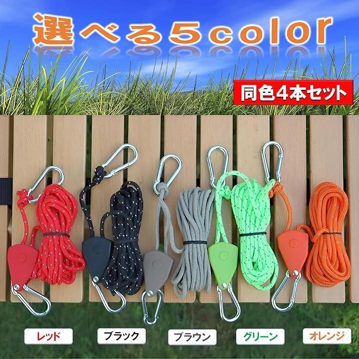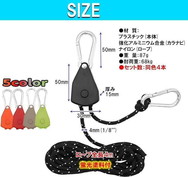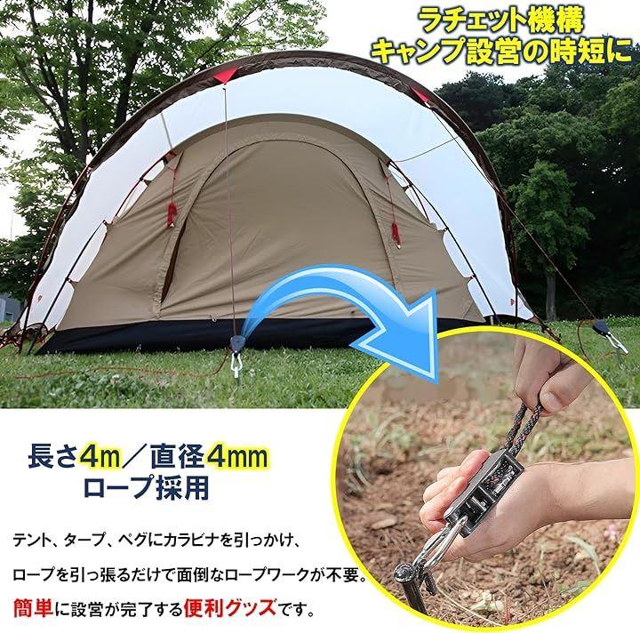 ・ロープラチェットは、テント、タープ、ペグにカラビナを引っかけ、ロープを引っ張るだけでアッと今に設営完了。ロープワーク自在金具不要で時短、簡単、便利なアウトドア、キャンプ用品。