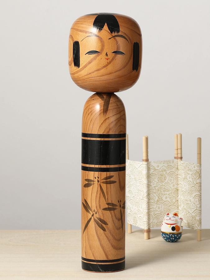 ★こけしカテゴリー:山形系伝統こけし★作者:佐藤 桝男(さとう ますお)★デザイン:山形系・佐藤正雄(1921–1997)作。木目に映えるトンボ模様が印象的なモノトーンのこけしです。秋空を舞うトンボの姿が穏やかな情景を思わせます。経年により顔に小さなへこみがあります。