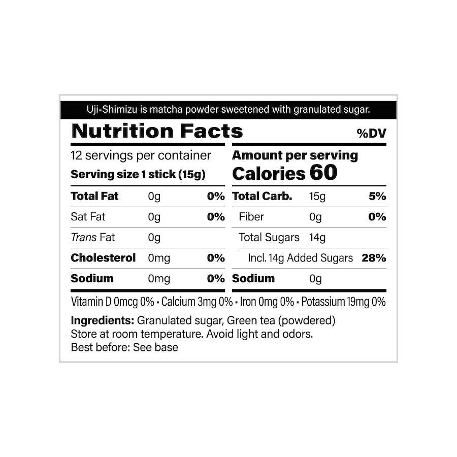 抹茶にグラニュー糖を加えた宇治清水(うじしみず)。携帯便利なスティック、バッグに入れてお出かけのお供にしても良し、友達にスティックを配って、皆で楽しんでも良し、好きなときに好きな場所で気軽に楽しめるのは個包装のスティックならでは。