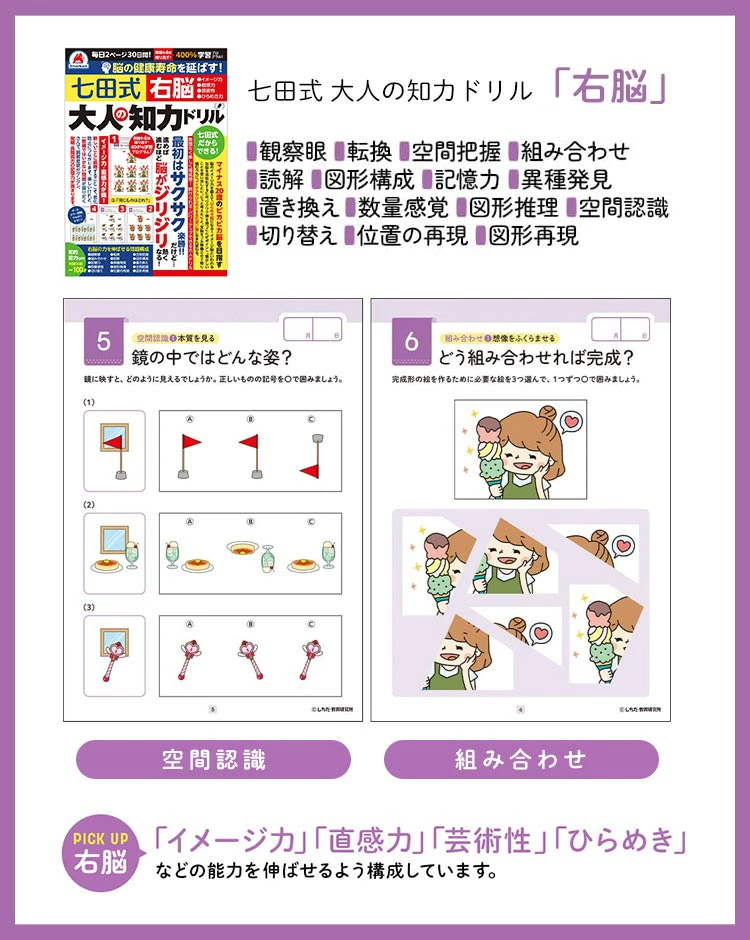 【七田式 大人の知力ドリル】多くの芸能人やスポーツ選手の才能を開花させたと注目を集めている『七田式教育』のノウハウを凝縮した、『大人向け』の七田式知力ドリル!簡単な問題から徐々に手応えのある問題をこなすことで脳力アップ。世代を問わず脳のトレーニングを楽しめるドリルです。自分用にはもちろん、ご両親やご親戚へのプレゼントにも◎