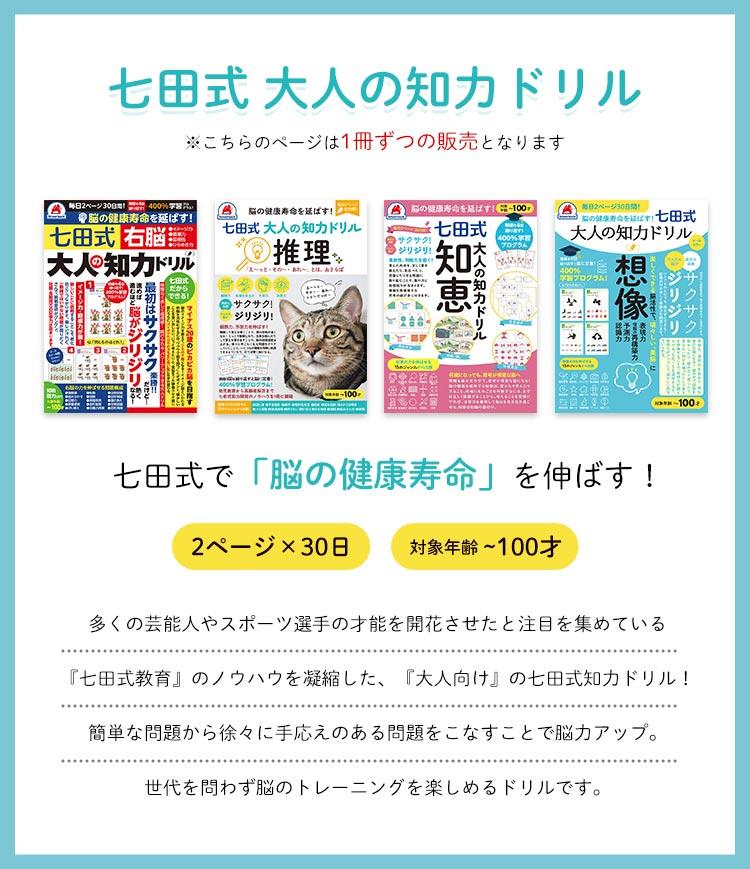 【七田式 大人の知力ドリル】多くの芸能人やスポーツ選手の才能を開花させたと注目を集めている『七田式教育』のノウハウを凝縮した、『大人向け』の七田式知力ドリル!簡単な問題から徐々に手応えのある問題をこなすことで脳力アップ。世代を問わず脳のトレーニングを楽しめるドリルです。自分用にはもちろん、ご両親やご親戚へのプレゼントにも◎