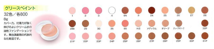 カバー力、付着力が強く伸びのよいクリーム状の油性ファンデーションで、舞台演劇用の代表的な化粧品です。色数が豊富ですので幅広い役柄の化粧ができ、和装花嫁、舞踊化粧の下地ファンデーションとしても多く使用されています。仕上げには、粉白粉(SW)で軽く押さえ、余分な油分を吸収させ肌になじませます。【ご使用方法】カットスポンジを水で固くしぼり、肌にフィットさせ塗ります。カバーしたい部分はパッティングします。【内容成分】〈2、3、H-2以外のグリースペイント〉ミネラルオイル・イソステアリン酸ヘキシルデシル・セスキオレイン酸ソルビタン・パルミチン酸セチル・パラフィン・ワセリン・カルナウバロウ・ラウリン酸亜鉛・ラノリン脂肪酸オクチルドデシル・トコフェロール・ダイズ油・香料・「+/-」・カオリン・酸化亜鉛・酸化チタン・酸化鉄・赤202・赤226・橙204・黄205【メーカー】 株式会社 三善【区分】日本製 化粧品【広告文責】株式会社グローバル通販、連絡先:0120-34-3728