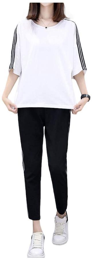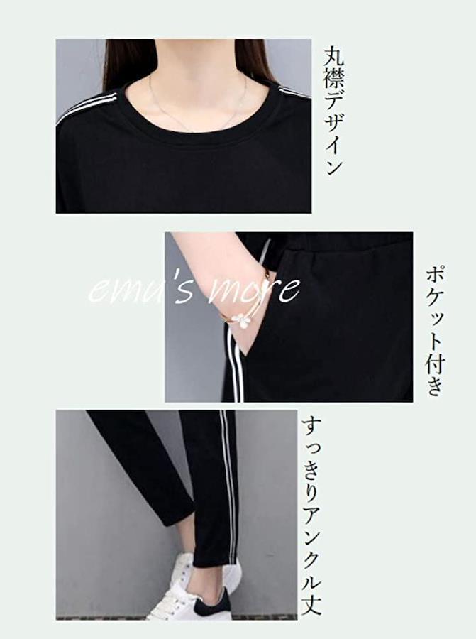 ・トップスは丸首で、二の腕が隠れる程度の袖丈となり、肩にはライン入りです。