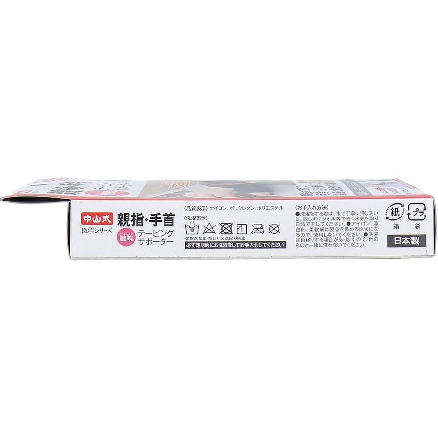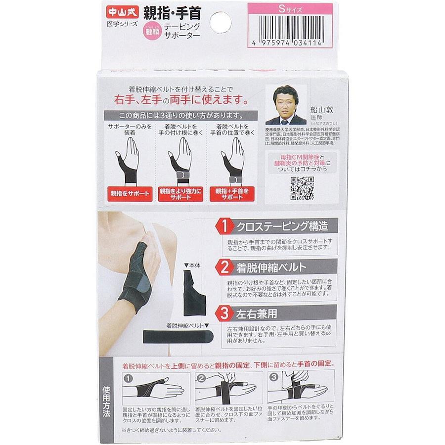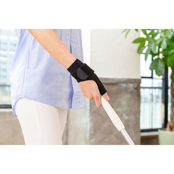 【使用方法】※着脱伸縮ベルトを上側に留めると親指の固定、下側に留めると手首の固定。(1)固定したい方の親指を筒に通し親指と手首が直線になるようにクロスの位置を調節します。(2)着脱伸縮ベルトを固定したい位置に合わせ、クロス下の面ファスナーに留めます。(3)手の甲側からベルトをぐるりと回して締め加減を調節しながら面ファスナーを留めます。※きつく締め過ぎないように装着してください。