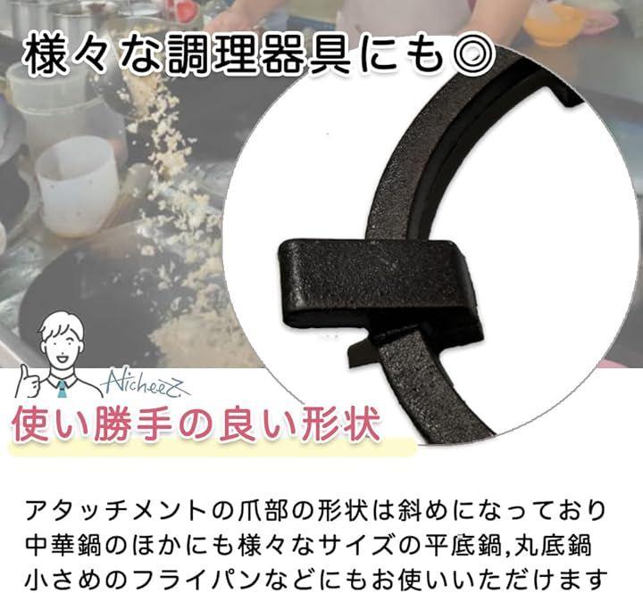 「様々な調理器具にも」アタッチメントの爪部の形状は斜めになっているので、中華鍋のほかにも様々なサイズの平底鍋、丸底鍋、小さめのフライパンなどにもお使いいただけます。