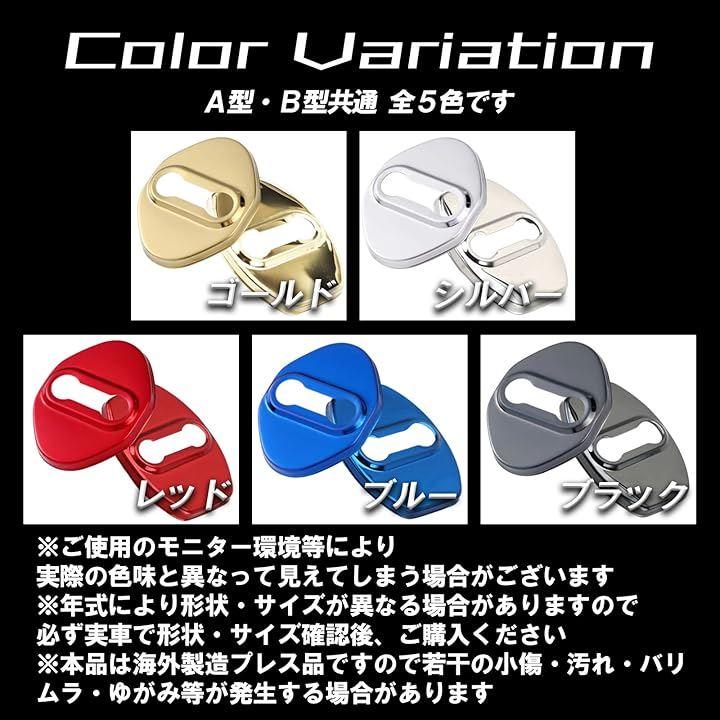 材質:ステンレス鋼製 サイズ:Aタイプ 縦:約68mm x 横:約53mmx高さ6mm Bタイプ:縦69mm x 横約53mmx高さ約5mm ブラック、ブルー、レッド、ゴールド、シルバーセット内容:ドアストライカーカバー 各色4個セット適合車種:プリウス、ランドクルーザープラド、ヴィッツ、エスティマ、マークX、カローラ、RAV4など(形状が一致する他車種にも対応)