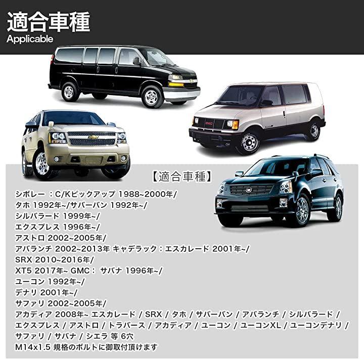 ・v「参考適合車種」:シボレー :C/Kピックアップ 1988~2000年/ タホ 1992年~/サバーバン 1992年~/シルバラード 1999年~/ エクスプレス 1996年~/アストロ 2002~2005年/アバランチ 2002~2013年 キャデラック:エスカレード 2001年~/SRX 2010~2016年/XT5 2017年~ GMC: サバナ 1996年~/ユーコン 1992年~/デナリ 2001年~/サファリ 2002~2005年/アカディア 2008年~ エスカレード / SRX / タホ / サバーバン / アバランチ / シルバラード / エクスプレス / アストロ / トラバース / アカディア / ユーコン / ユーコンXL / ユーコンデナリ / サファリ / サバナ / シエラ 等 6穴 M14x1.5 規格のボルトに御取付頂けます。