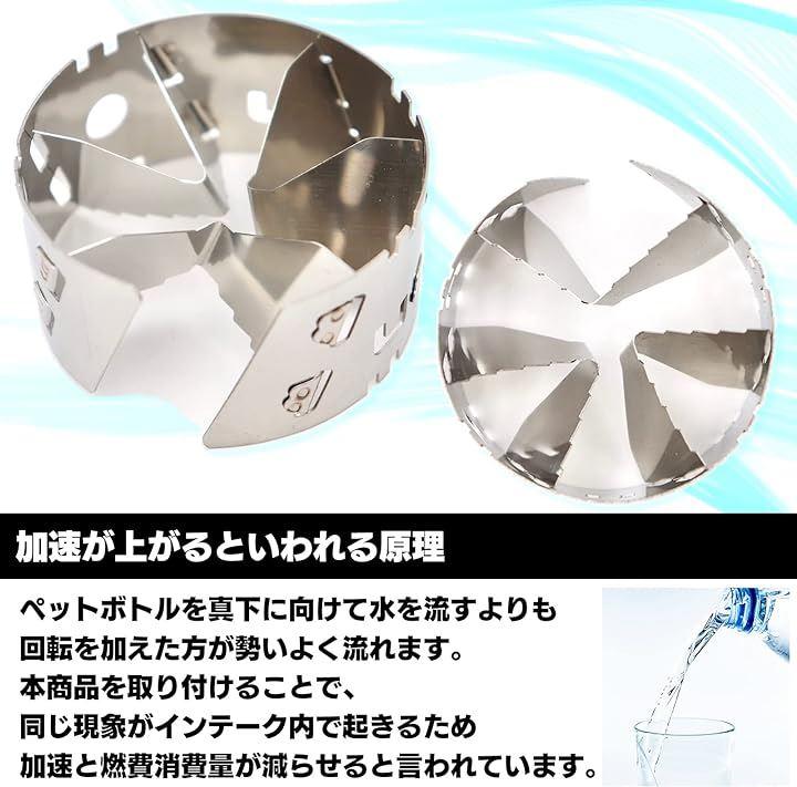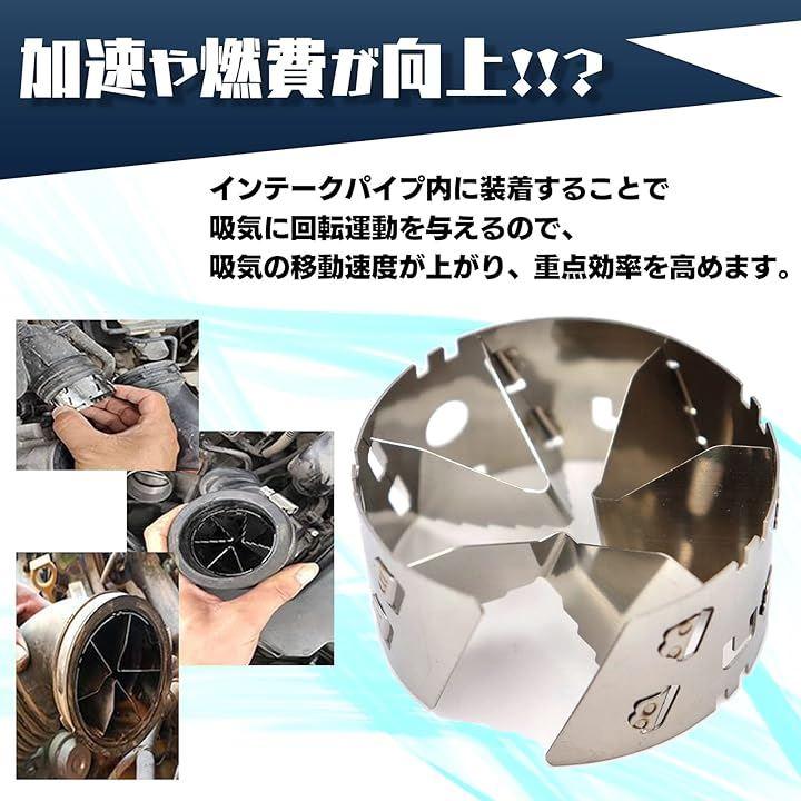 エアインテークパイプ内に装着することで吸気に回転行動を与え、吸気の速度が上がり、重点効率を高める効果があります。