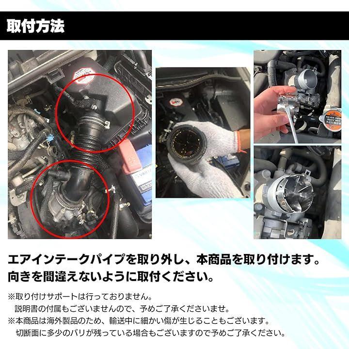 ・エアインテークパイプ内に装着することで吸気に回転行動を与え、吸気の速度が上がり、重点効率を高める効果があります。