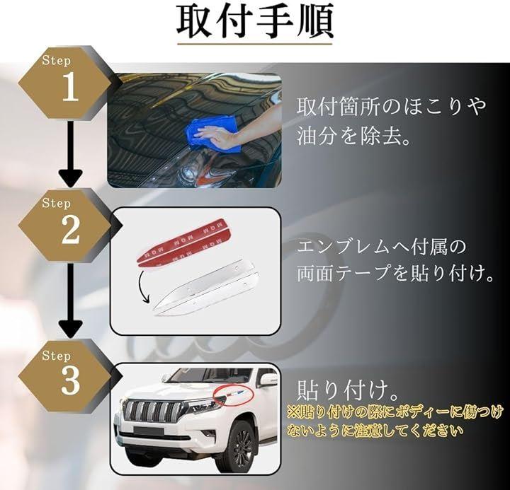 「3ステップ取付」作業は付属の両面テープ固定のみ。工具不要の3ステップ取付ですぐに愛車をオシャレにカスタムできるアクセサリーです。