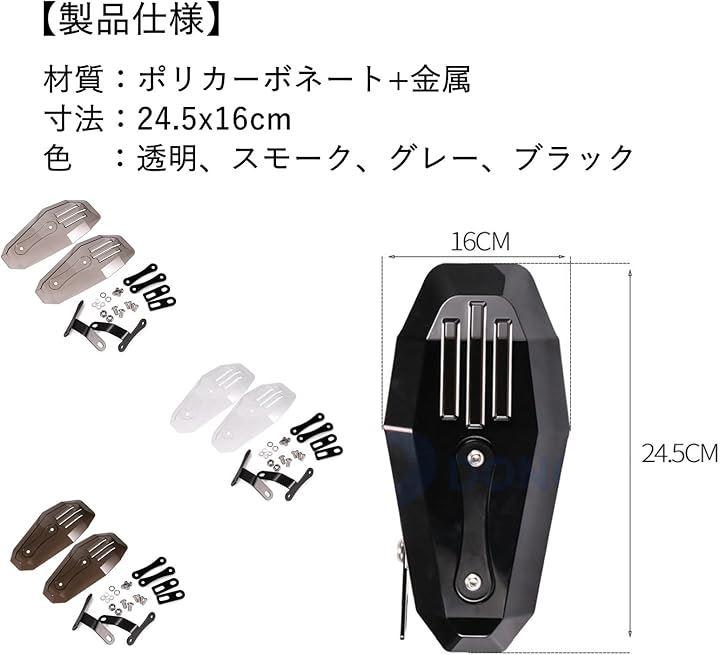 「製品仕様」材質:ポリカーボネート、寸法:24.5x16cm、色:透明、スモーク、グレー、ブラック