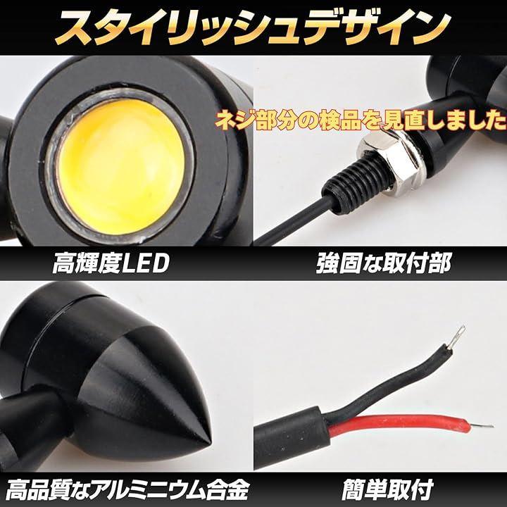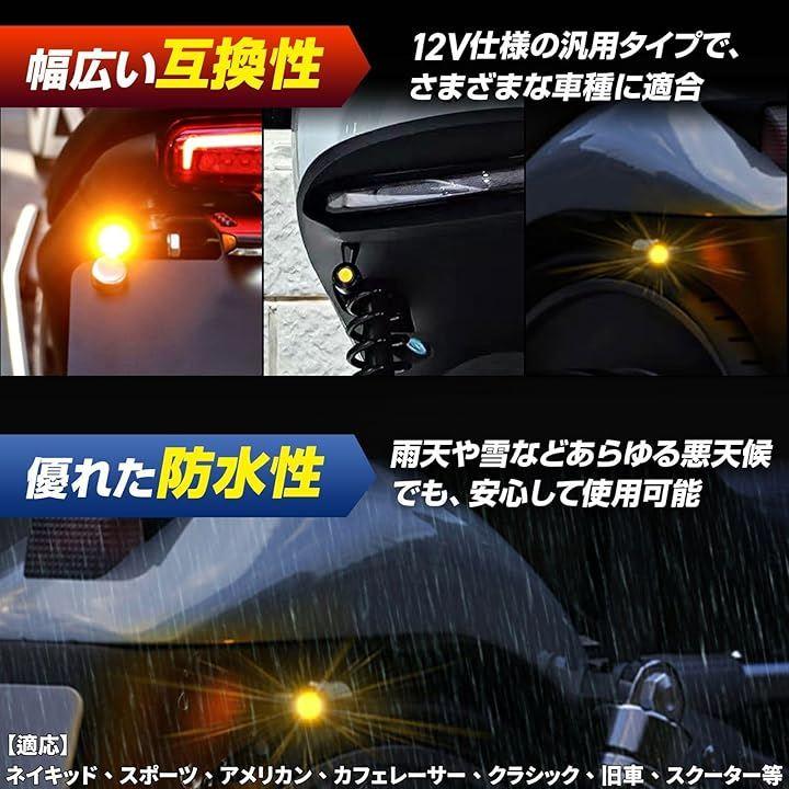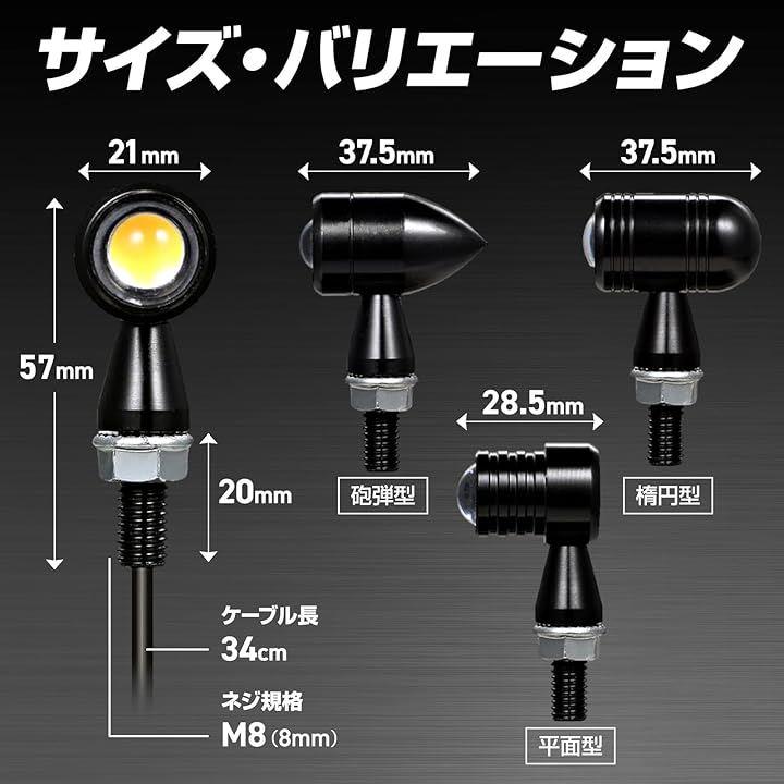 「砲弾型xスタイリッシュ」スタイリッシュな砲弾型デザインのバイクLED小型ウインカーは、12Vの汎用設計で、ネイキッド、スポーツ、アメリカン、カフェレーサー、クラシック、旧車、スクーターなど様々な車種に合わせやすい防水仕様の高輝度ミニウインカーです。