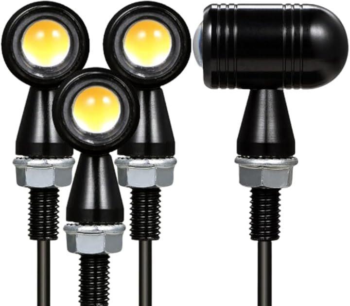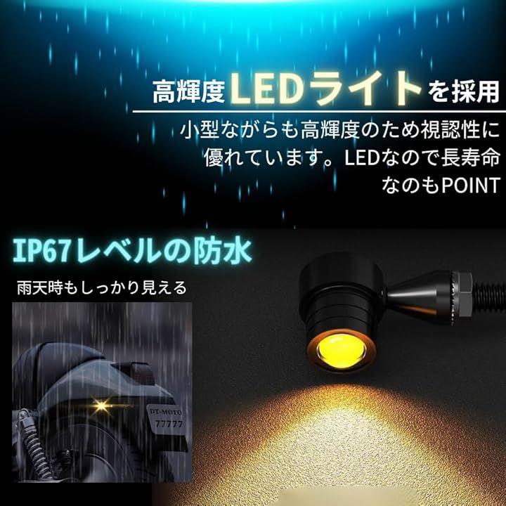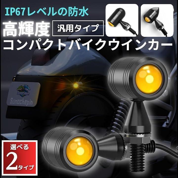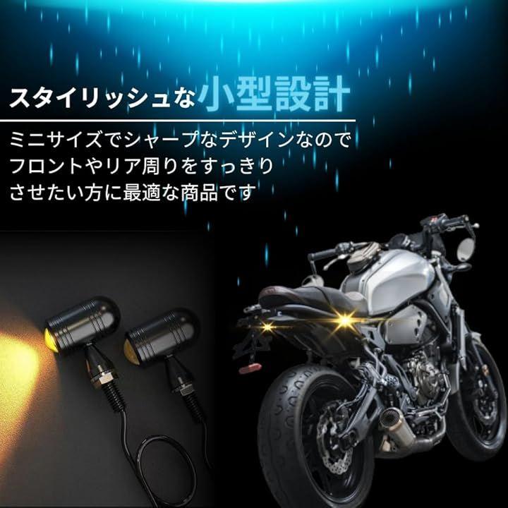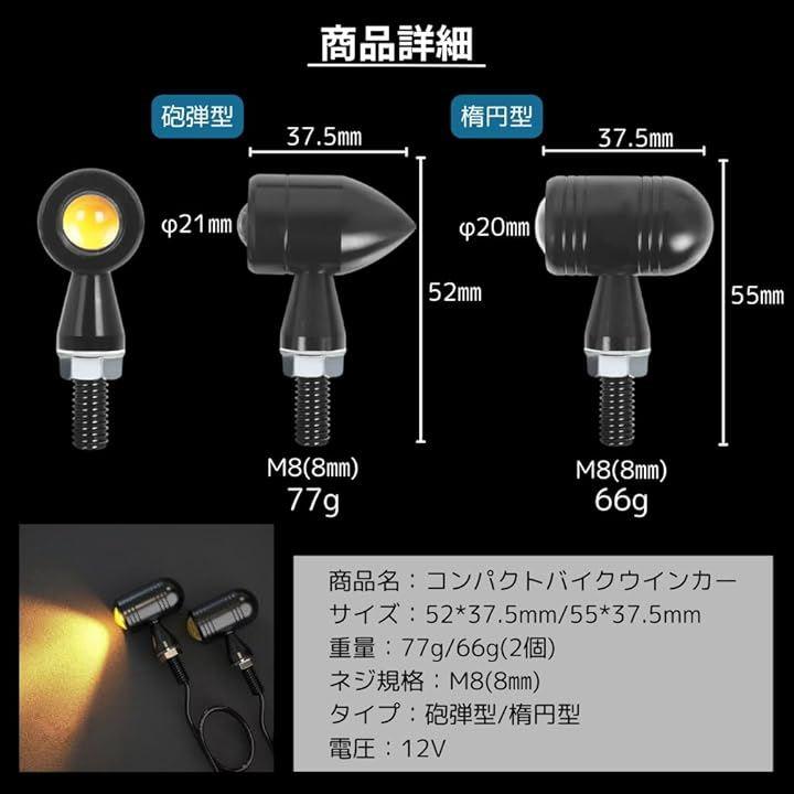 「詳細」サイズ:本体奥行37.5mmx幅21mm、ボルト部分20mm、M8ネジの配線長さ45cm / 搭載LED:COBチップ / 取付けボルトサイズ:M8(8mm) / 電圧:12V / 発光色:アンバー(オレンジ) / 材質:航空機仕様アルミ合金 / セット内容:LEDミニウインカー2個セットor4個セット