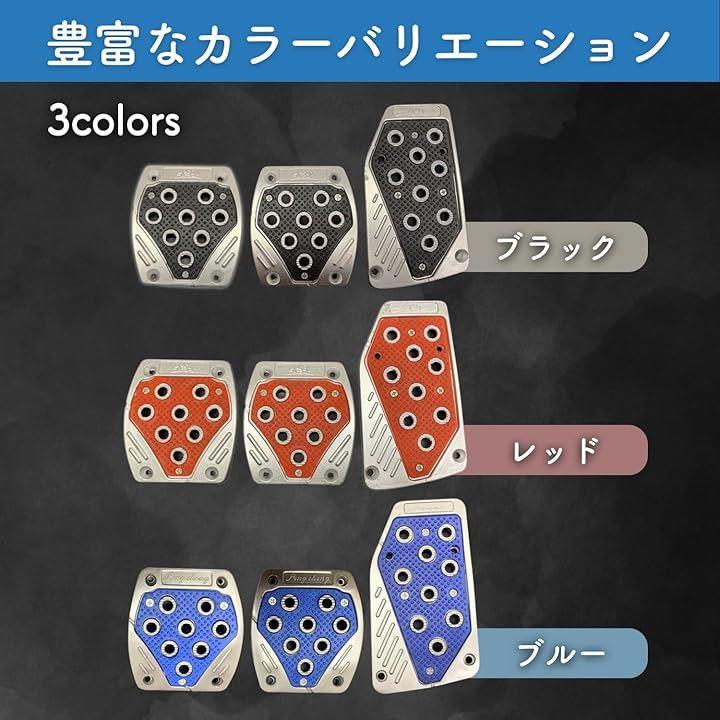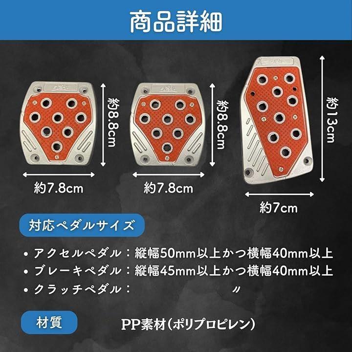 「商品仕様」サイズ : アクセル用 約7x13cm、ブレーキ用 約7.8x8.8cm、クラッチ用 約7.8x8.8cm(重量 : 130g)/3個並べたサイズ : 約26.5 x 18.5 x 2.5 cm / 材質:PP素材(ポリプロピレン) / *ブラック(黒)とレッド(赤)とブルー(青)のカラーバリエーションをご用意しているので、お好きな色をお選びください。