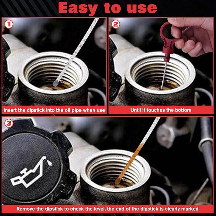 「使用方法」ディップスティックをオイルパイプに底につくまで差し込み、取り出してレベルを確認する。