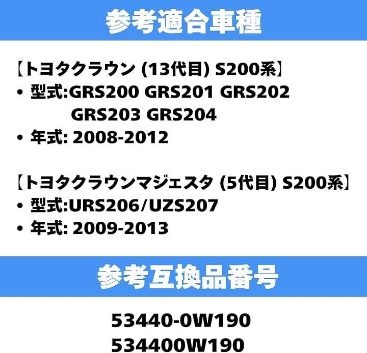 「参考適合車種」 「クラウン(13代目)S200系」 型式:GRS200 / GRS201 / GRS202 / GRS203 / GRS204 (年式:2008年~2012年) 「クラウンマジェスタ(5代目)S200系」 型式:URS206 / UZS207 (年式:2009年~2013年)