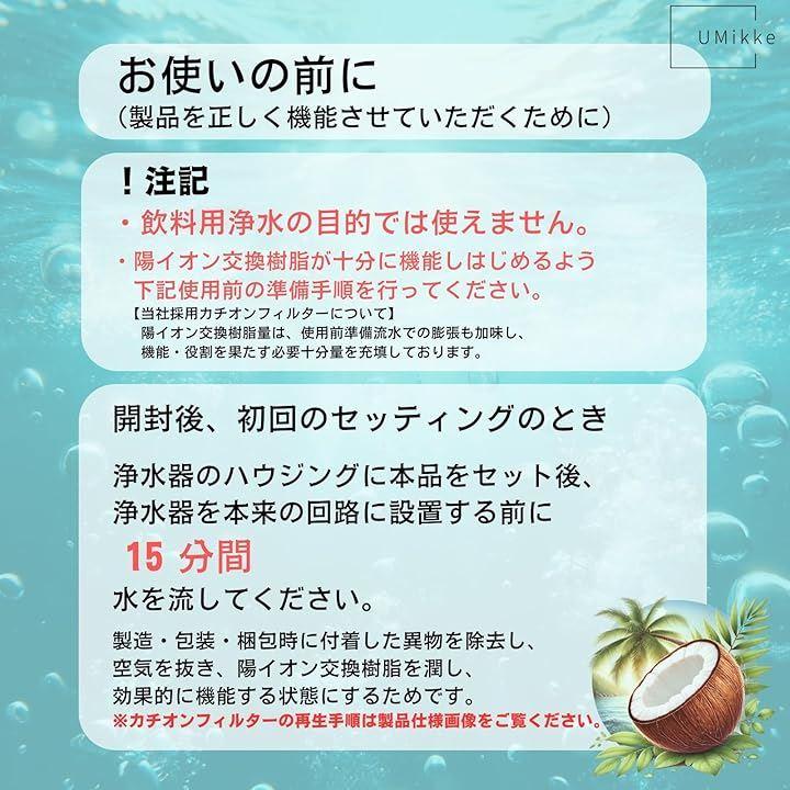 イオン交換樹脂は使用に伴い処理能力が低下します、定期的に再生作業を行い機能再生を繰り返し寿命を最大化しましょう、再生作業手順は当商品の商品画像をご覧ください