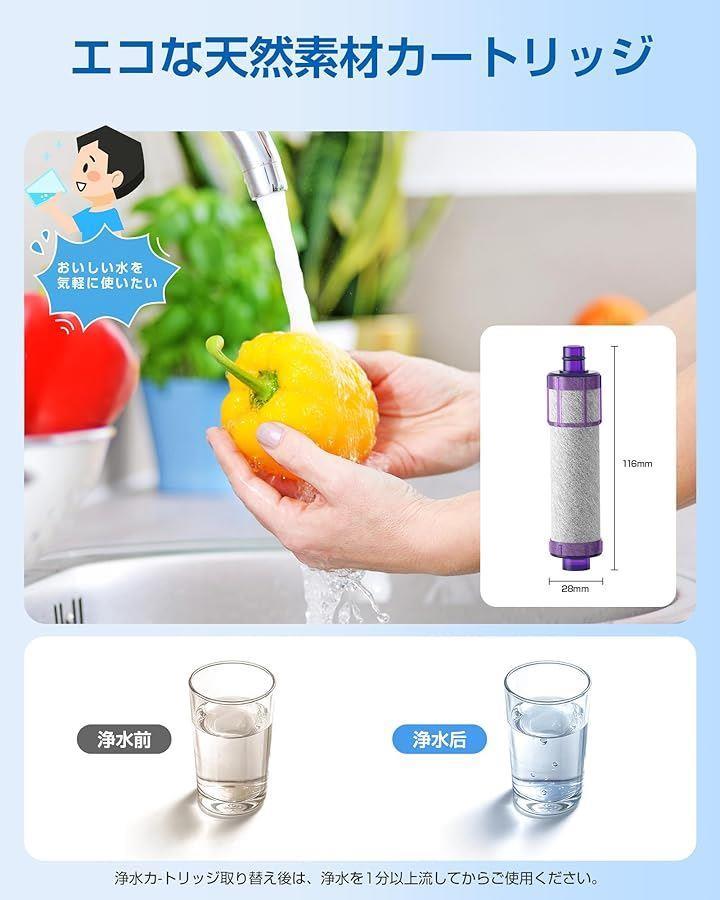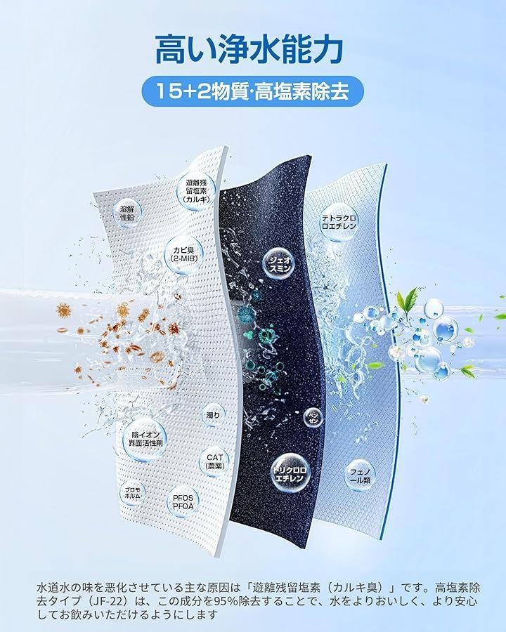 「15+2種類の不純物をしっかり除去」遊離残留塩素、カルキ臭、農薬、トリハロメタン、溶解性鉛など、合計17種類の有害物質を吸着。