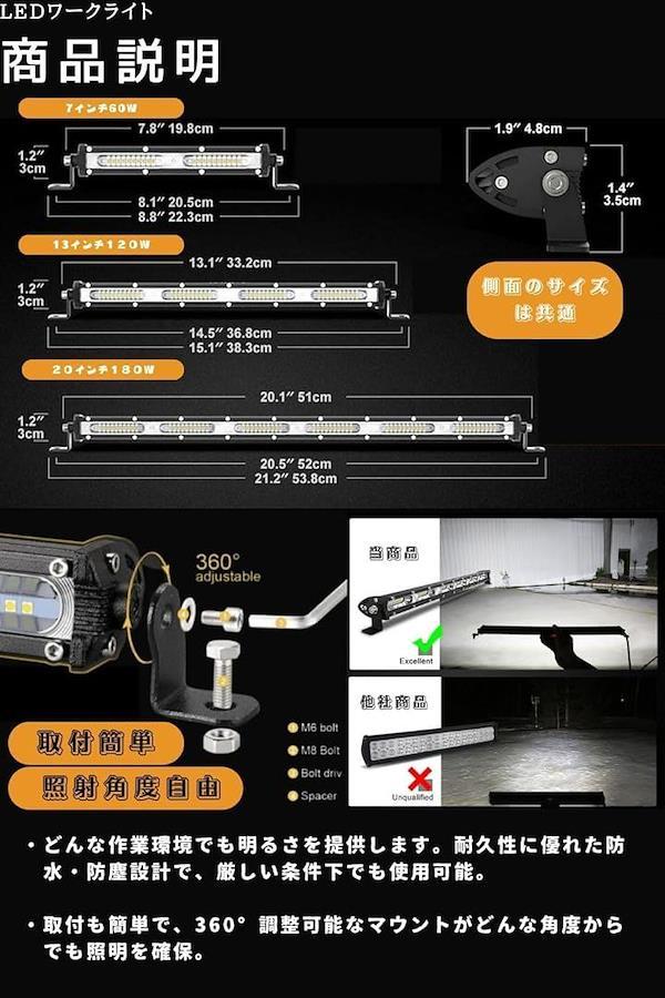 LEDワークライト ライトバー60W/ 120w/ 180W 7/ 13/ 20インチ のledワークライト 12v/24v 汎用作業灯はコンボビームと三列リフレクターによりled作業灯24vは高輝度となっています。