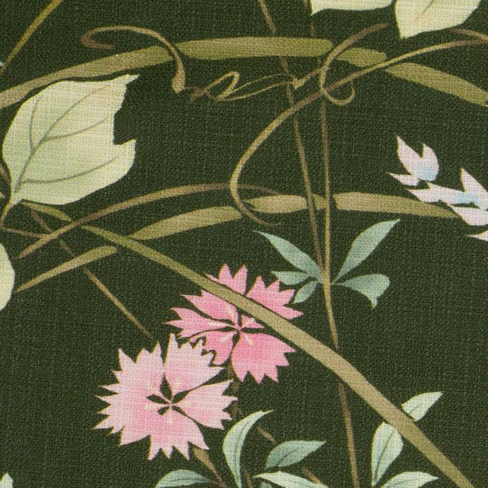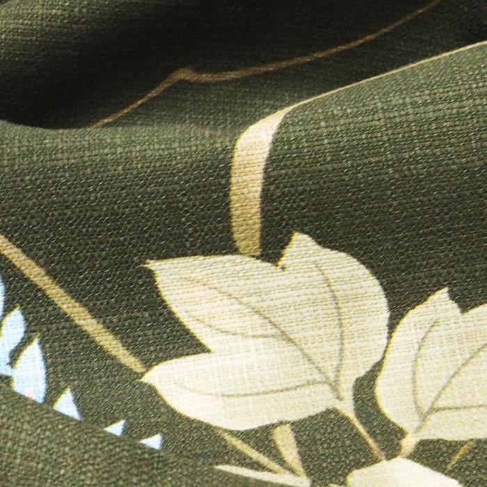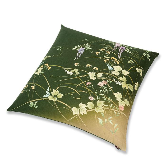全体にあしらわれた「藤と秋草」は着物の友禅染のような繊細さ。細やかな表現を得意とするデジタルプリントで染めました。地色の深い緑に陽だまりが出来たようなボカシに、草花がより柔らかく映えます。お部屋を上品に、ひときわシックに飾ってくれることと思います。生地は異なる太さの糸を使い平織りとなな子織りを組み合わせて織られたブッチャー生地で、格子のような織り模様があり、しっかり柔らかな手触りが心地よく織り糸の表情が感じられる素材です。裏側は利休の無地で作りました。【カバーサイズ】 横65㎝×縦69㎝【生地素材】 綿(ブッチャー)100%この商品はカバー(ファスナー加工)のみです。中わたは別途ご購入ください。またカートの購入可能数より多い数をご希望の場合はご相談ください。