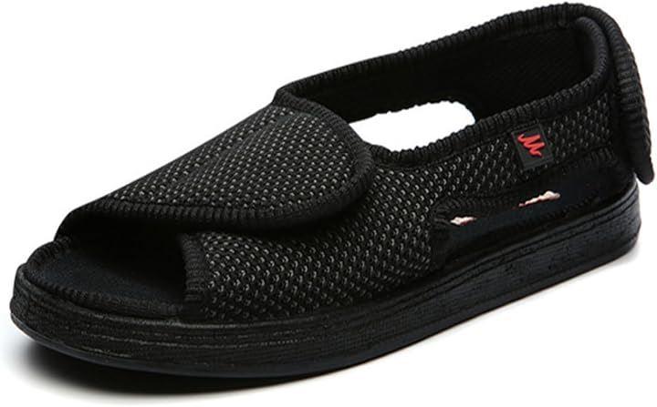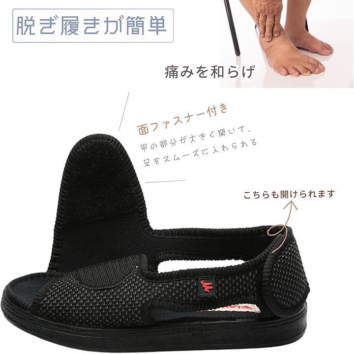 「脱ぎ履きが簡単」面ファスナー付きで甲の部分が大きく開いて、足をスムーズに入れられ、脱ぎ履きも簡単。