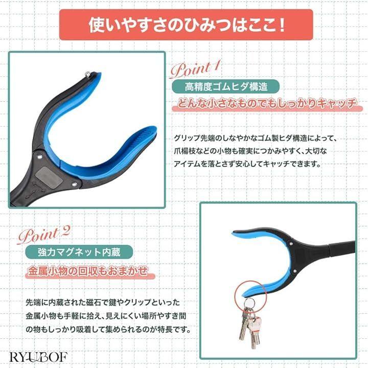 「磁石機能で金属小物も簡単回収」先端に内蔵された磁石で鍵やクリップといった金属小物も手軽に拾え、見えにくい場所やすき間の物もしっかり吸着して集められるのが特長です。