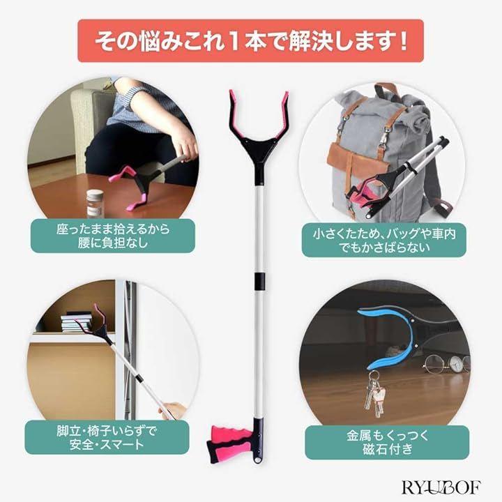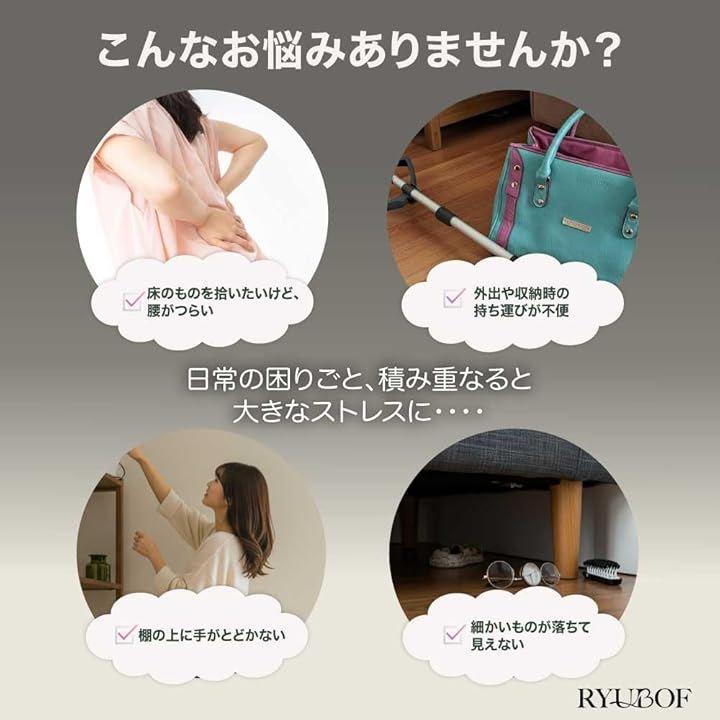 「しゃがまずに掴める快適サポート」腰を曲げず立ったまま使えるリーチャーは、床に落ちた物や高い棚の荷物もラクに取れ、家事や片付けの効率がアップする便利グッズです。