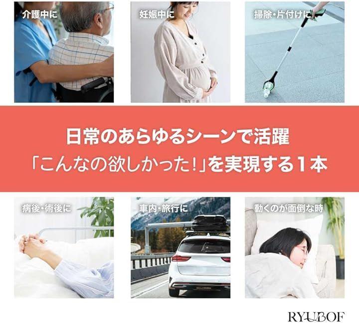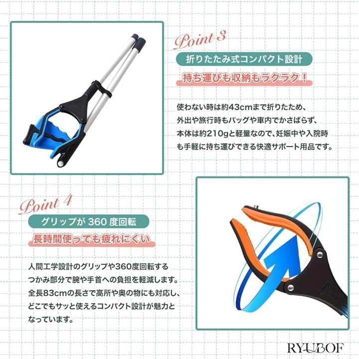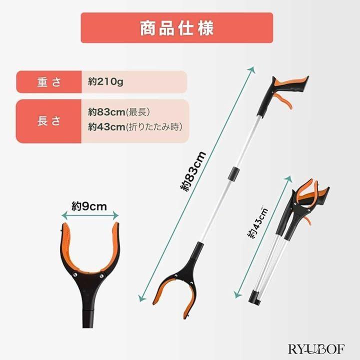 「83cmの全長&軽量で使いやすい」全長83cmの長さで高所や奥の物にも対応し、本体は約210gと軽量なので、妊娠中や入院時も手軽に持ち運びできる快適サポート用品です。