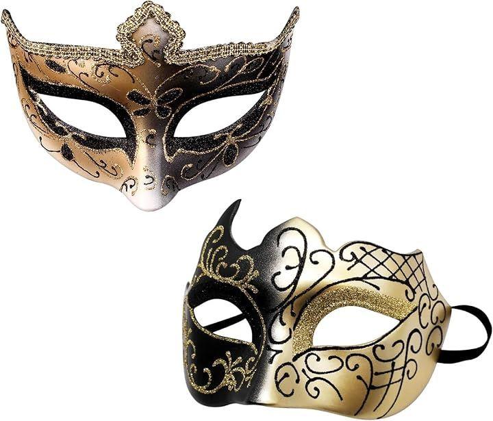 仮面 ベネチアンマスク:贅沢に施されたキラキラ輝くラメが妖艶な、男性向けのデザインと女性向けデザインのマスカレードマスクのセット。