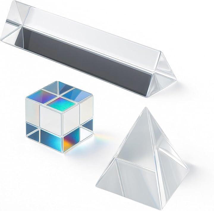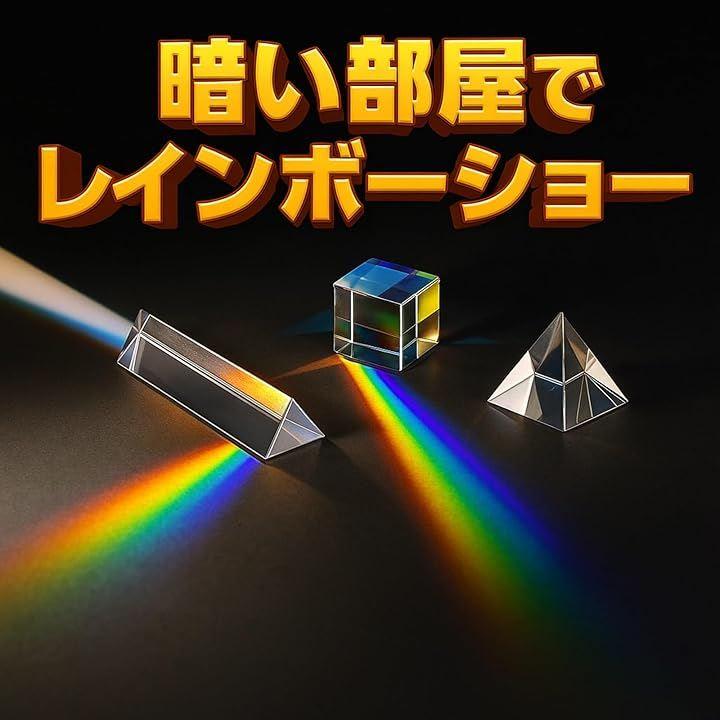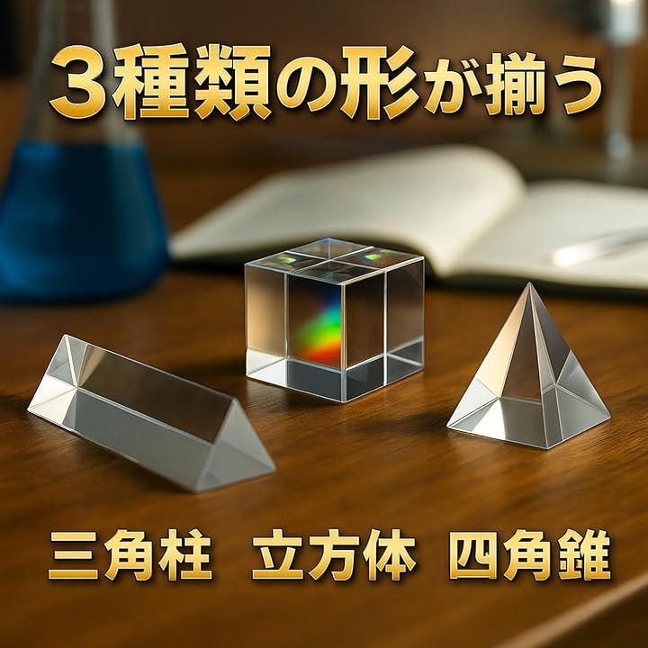 「3種類の光学プリズムセット」三角プリズム・角柱プリズム・立方体プリズムの3種類を揃えました。