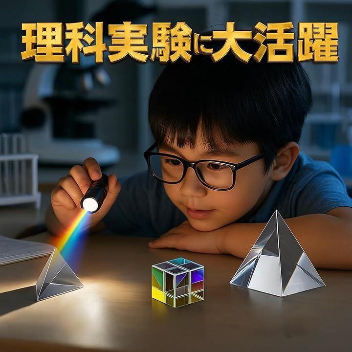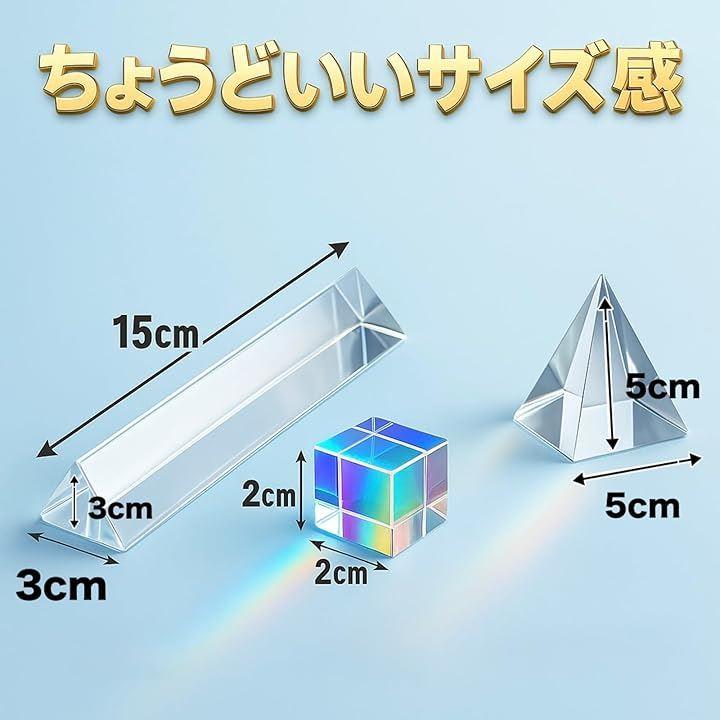 「サイズ‧仕様」長い三角柱プリズム:約3cm角x長さ15cm立方体プリズム:約2x2x2cm四角錘プリズム:高さ約5cm材質:光学ガラスセット内容:三角柱x1、立方体x1、四角錘x1カラー:クリア