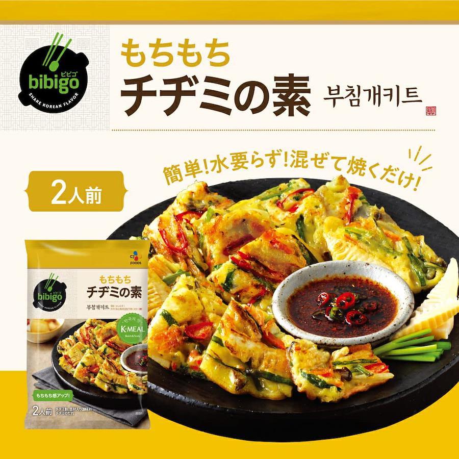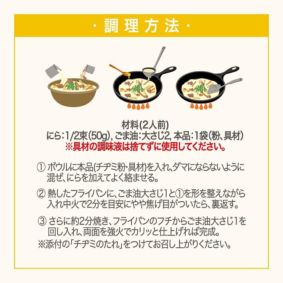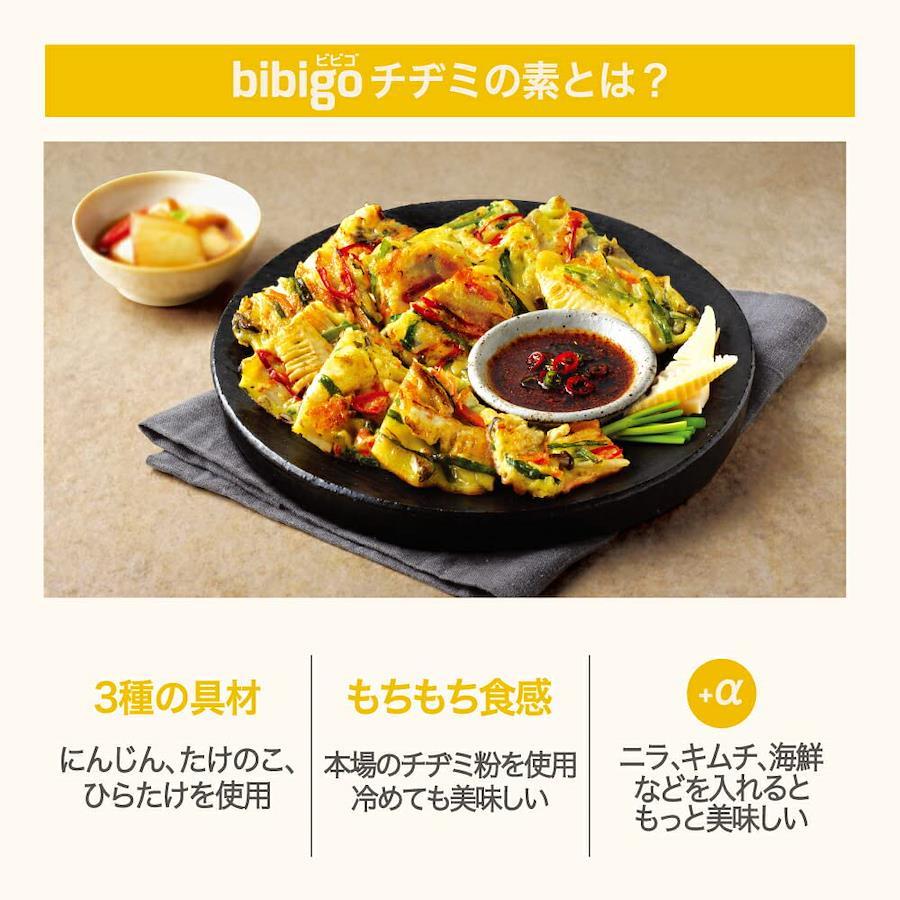 野菜入り具材[にんじん、たけのこ、ひらたけ、たん白加水分解物、あさりエキス、食塩、イカエキス、ほたてエキス/調味料(アミノ酸)、酸化防止剤(ビタミンC)]、チヂミ専用粉[小麦粉、食塩、砂糖、とうもろこしでん粉、にんにく、たまねぎ、こしょう/ベーキングパウダー、増粘剤(キサンタンガム)、着色料(ビタミンB2)](韓国製造)、チヂミのたれ[しょうゆ、りんご酢、アミノ酸液、砂糖、魚醤、ガーリックエキス、にんにく、長ねぎ、水あめ、食塩、ぶどう糖、唐辛子/調味料(アミノ酸等)、酸味料、増粘剤(キサンタンガム)]、(一部に小麦・いか・さけ・大豆・りんごを含む)