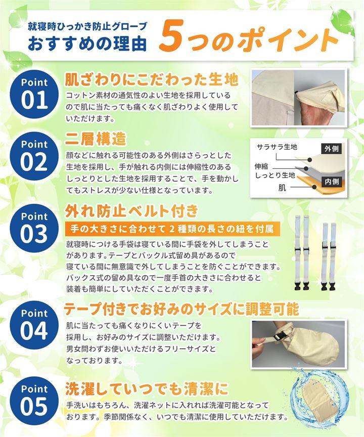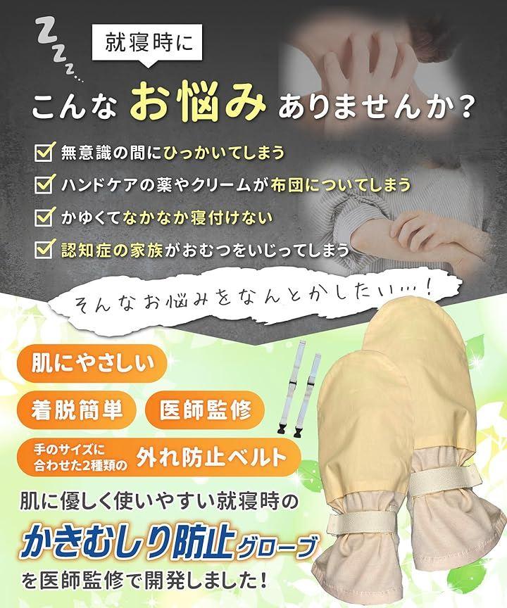 就寝時のかきむしりなどをお悩みの方に、肌に優しく使いやすいかきむしり防止手袋となっています。