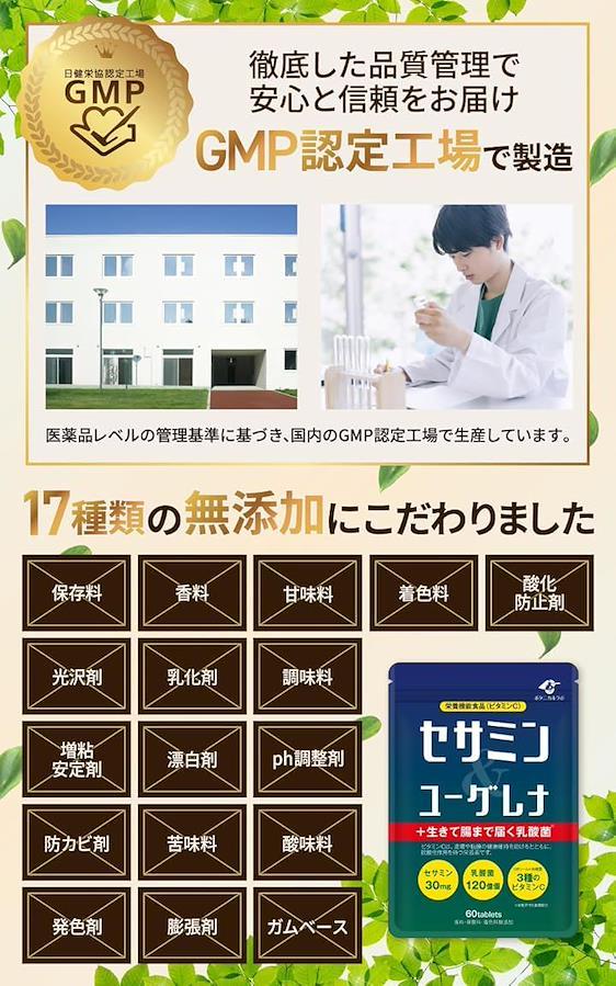 原材料 乳糖(オランダ製) ゴマエキス末(ゴマを含む) 乳酸菌末(乳酸菌(殺菌) デキストリン) 有胞子性乳酸菌 ユーグレナ粉末 イソマルトオリゴ糖 乳酸菌混合末(デキストリン 乳酸菌混合末(ビフィズス菌5種 乳酸菌17種) 乳糖(乳成分を含む) 加工油脂 脂肪酸/セルロース ビタミンC ステアリン酸カルシウム 微粒酸化ケイ素 ヒマワリレシチン ビタミンP