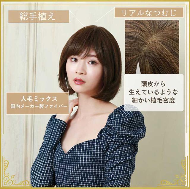 ウィッグ特有のツヤを軽減した新ファイバーと人毛をミックス。