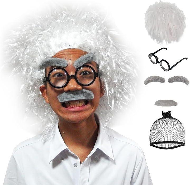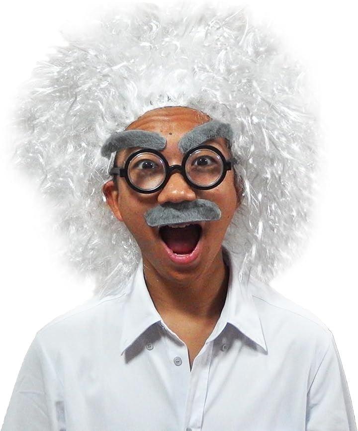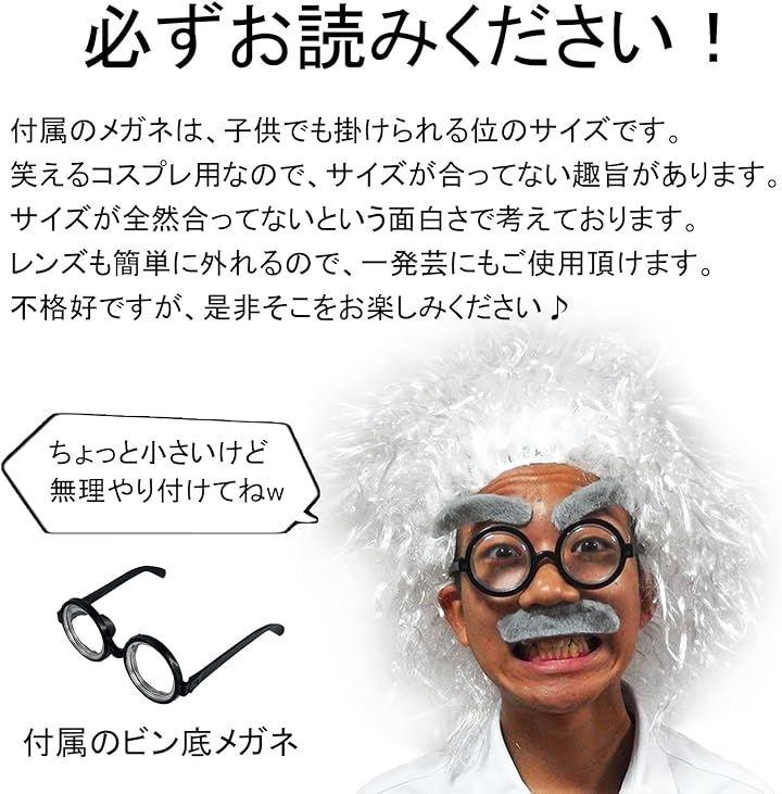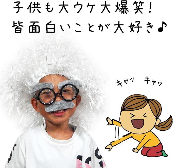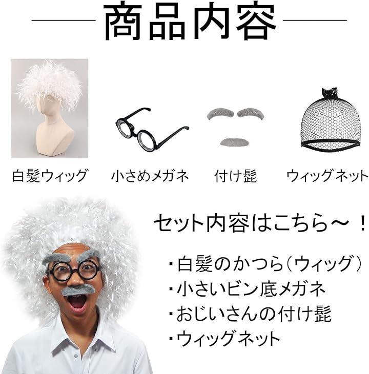 コスプレセット内容:白髪のかつら、ひげ(シール)、メガネ(とても小さいです)、ウィッグネット ちょっと間抜けな博士の本格的な変装をサポートします。 子供の遊び道具や、おもしろグッズとして、様々なシーンでユーモラスな雰囲気をいかがでしょうか。