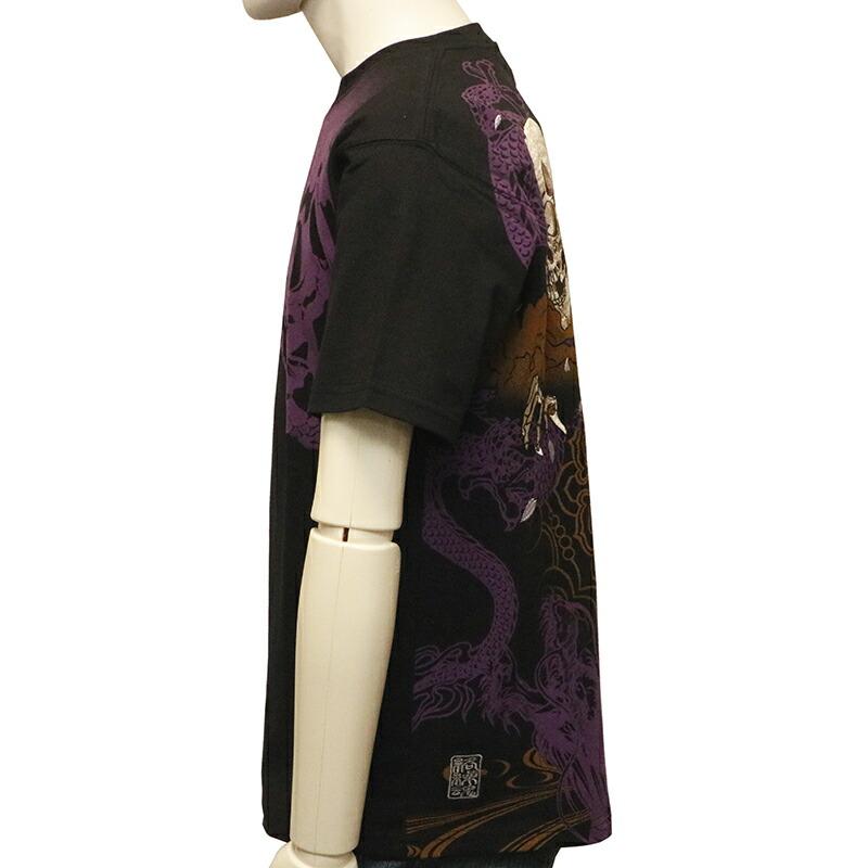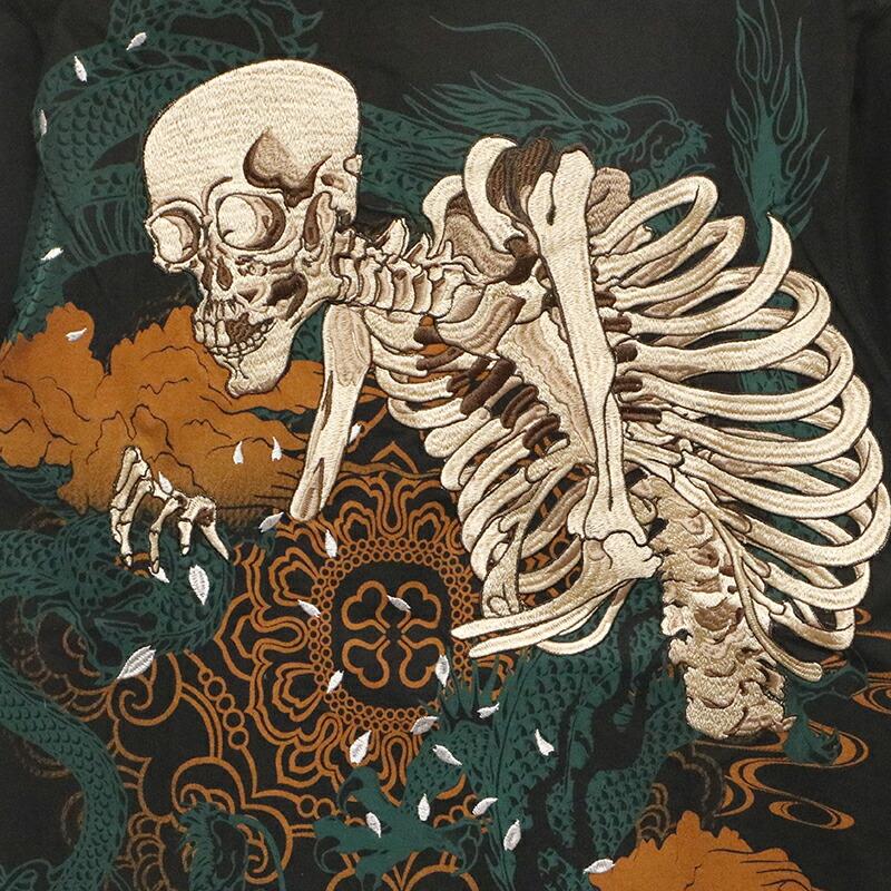 【デザイン】古都古都 × 絡繰魂から和柄半袖Tシャツのご紹介です。がしゃ髑髏 柄 刺繍 和柄 半袖Tシャツです。以前絡繰魂で好評だったデザインを古都古都でリバイバルしました。妖怪「がしゃ髑髏」を刺繍で落とし込んだ半袖Tシャツ。背景には龍や雲、流水などを組み合わせ抜染プリントで配置。フロントには、左胸にがしゃ髑髏の顔を抜染プリントで配置。袖には「餓者髑髏」を刺繍。絡繰魂らしいデザインに仕上がりました。